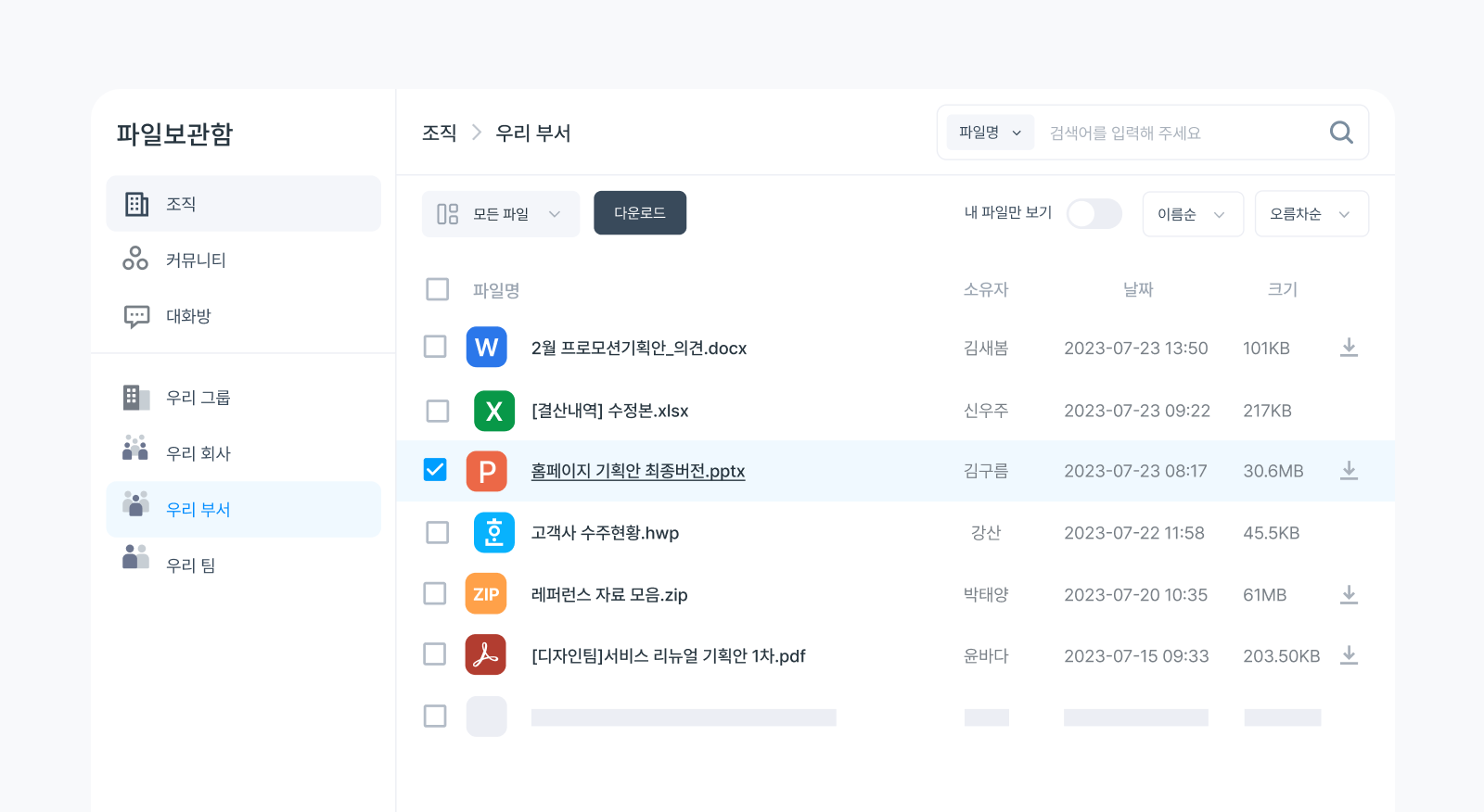 뉴스피드와 메신저에 올린 파일을 모아볼 수 있는 '저장소' 이름이 '파일보관함'으로 변경되었습니다. 상단 메뉴 또는 앱 서랍에서 파일보관함을 확인해 보세요!