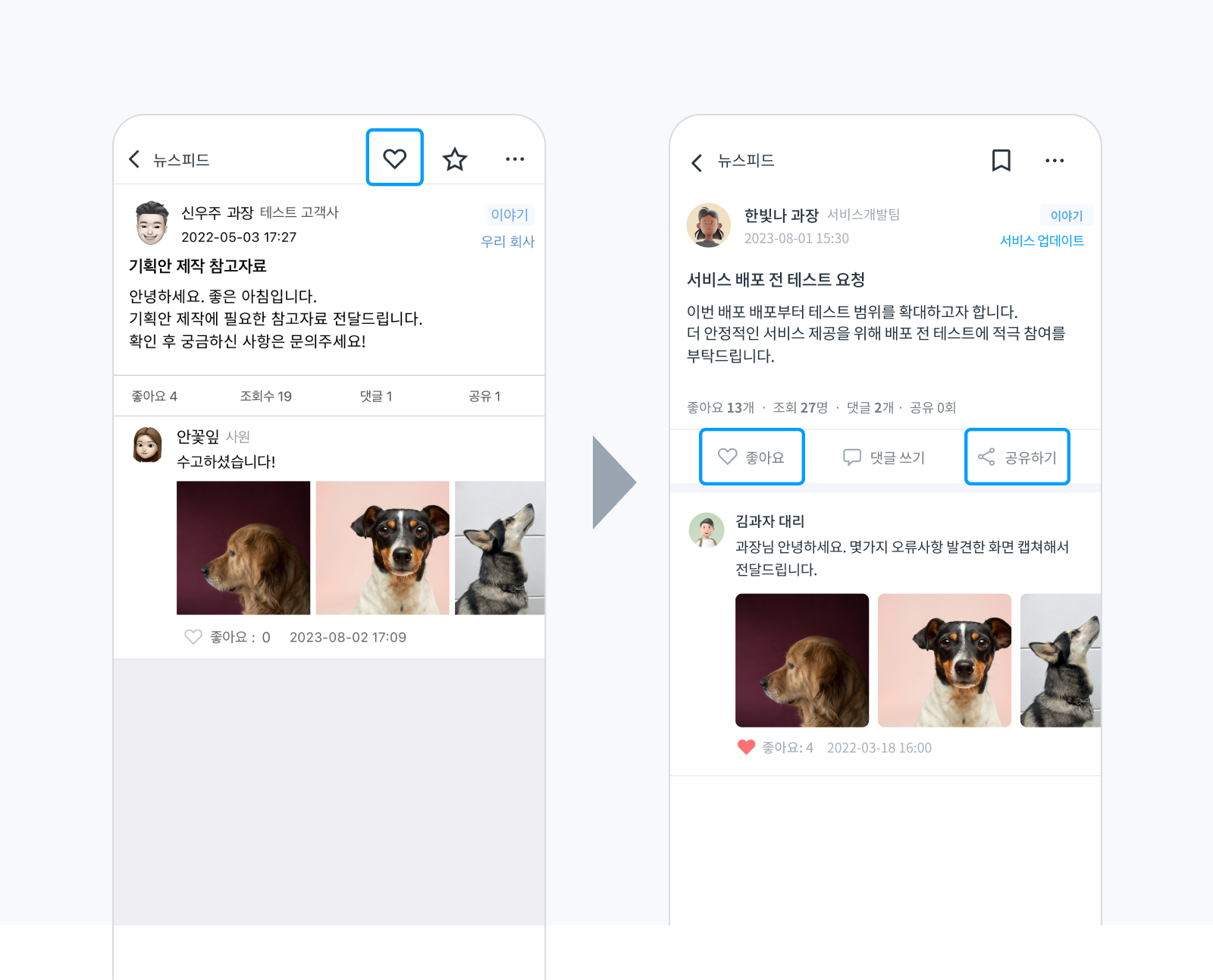 게시물을 읽고 바로 반응하고 공유할 수 있도록 좋아요 아이콘과 공유하기 버튼의 위치를 웹과 동일하게 변경했습니다. '좋아요'를 표시한 인원은 이전과 같이 숫자를 터치했을 때 바로 확인할 수 있어요.