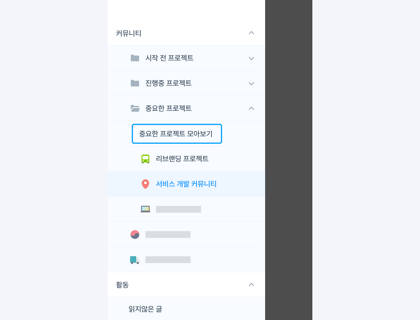 8월 업데이트를 통해 실제 사용자들의 메뉴 사용 빈도에 따라 왼쪽 메뉴 배치를 편리하게 수정하고, 커뮤니티 폴더 기능과 모아보기 기능을 새롭게 추가했습니다.