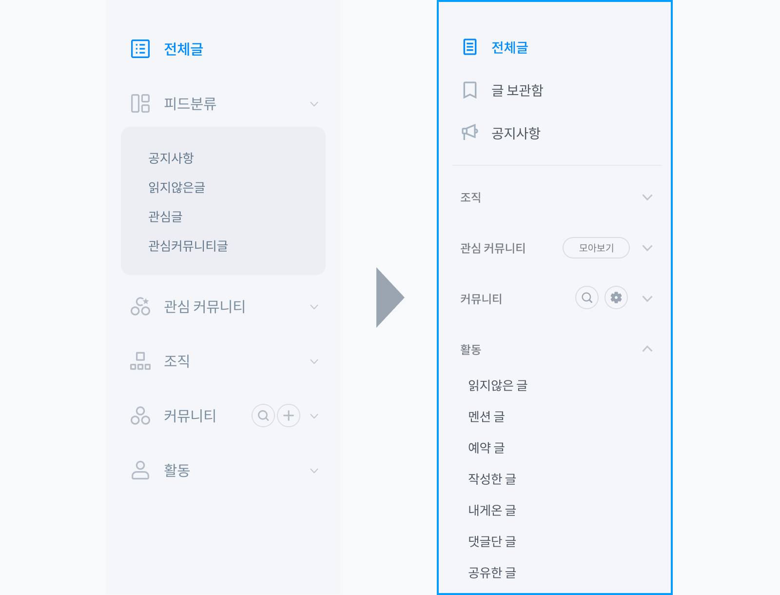 기존 티그리스 왼쪽 메뉴는 [전체글], [피드분류], [관심 커뮤니티], [조직], [커뮤니티], [활동]으로 구분되어 있었는데요.