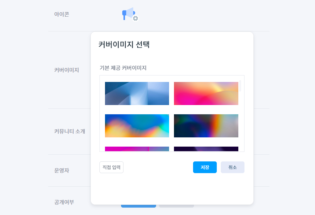 커뮤니티 성격을 더 잘 표현할 수 있도록 다양한 커뮤니티 아이콘과 커버 이미지를 새롭게 추가했습니다. 이미 개설한 커뮤니티라면 아래 방법으로 아이콘과 커버 이미지를 변경해 보세요.