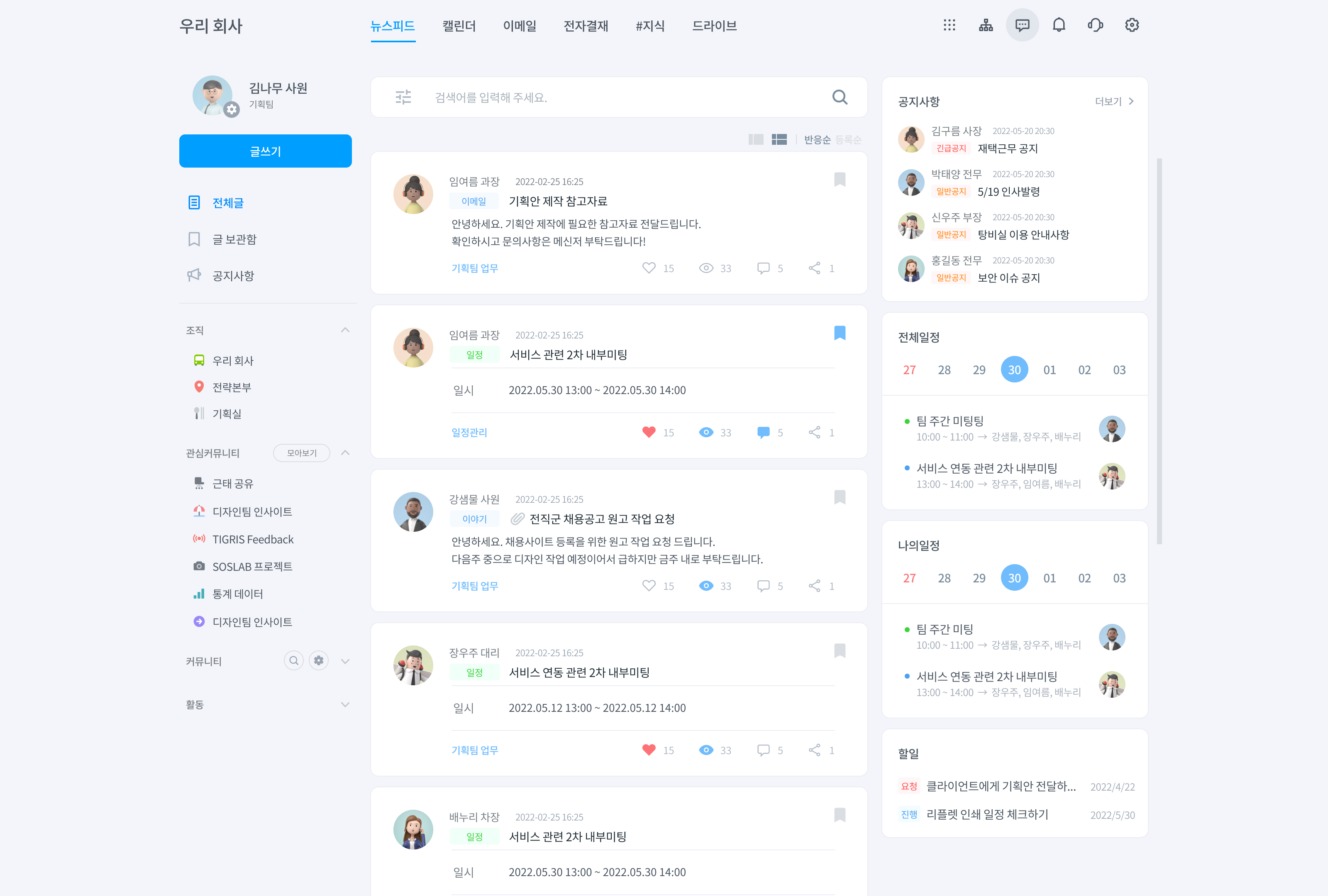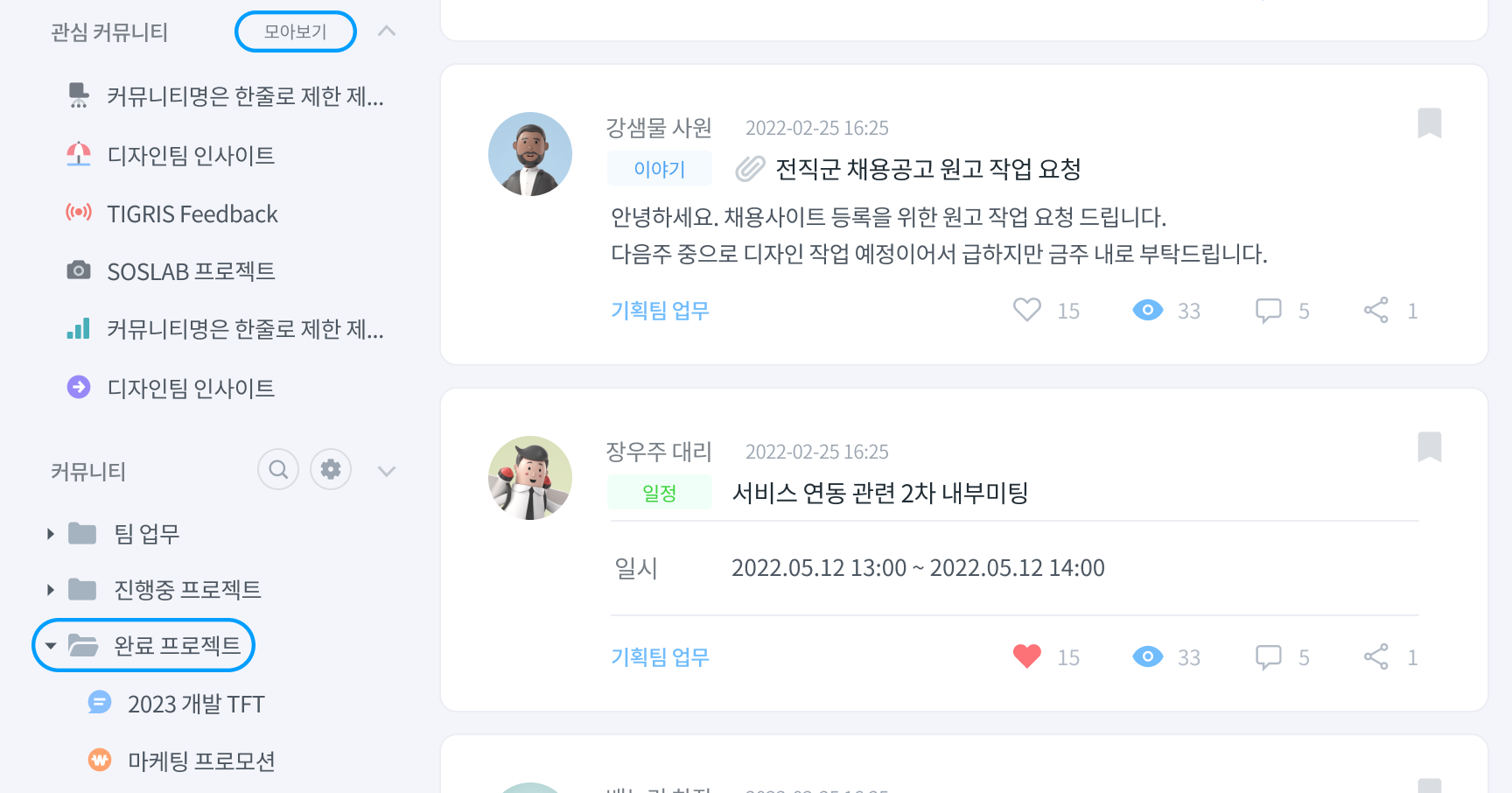 커뮤니티 폴더별로 글을 모아보는 것도 가능한데요. 커뮤니티 폴더를 클릭하면 폴더 내 모든 커뮤니티의 글이 나타납니다.