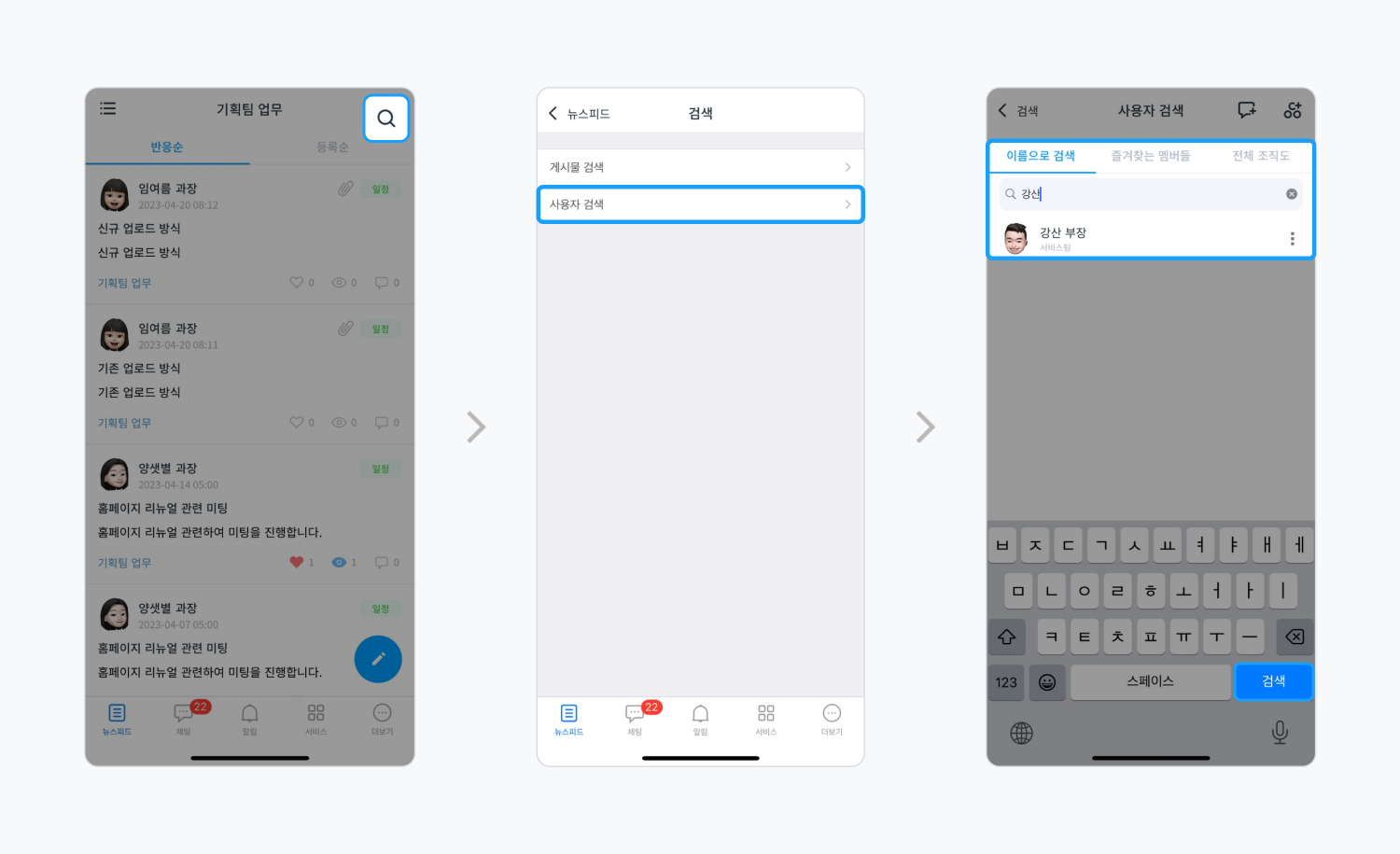 티그리스는 모바일에 게시물 검색과 함께 사용자 검색을 지원하고 있는데요. 구성원의 프로필을 확인해야 하거나 신속하게 대화를 시작해야 할 때 검색 기능으로 시간을 단축할 수 있습니다.