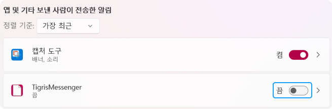 2. 앱 및 기타 보낸 사람이 전송한 알림 영역에서 TigrisMessenger 오른쪽 버튼을 클릭해 '끔' 상태로 변경해 줍니다.
