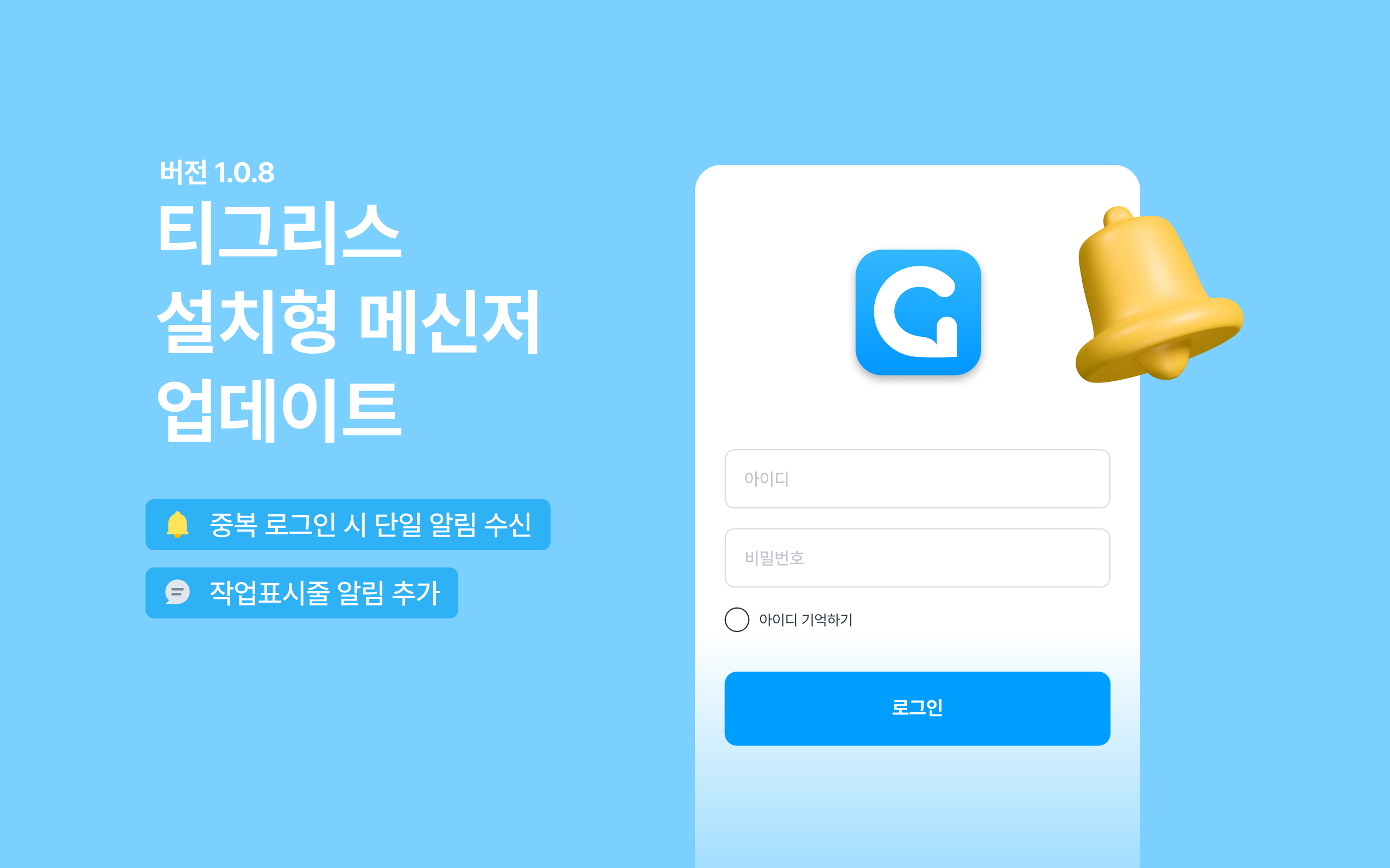 공개 이후 알림 등 불편하다고 말씀해 주신 부분을 개선해 어제 새 버전(TigrisMessenger-1.0.8)을 배포했는데요. 기존에 설치형 메신저를 다운로드한 분들이라면 별도의 다운로드 절차 없이 새 버전을 사용하실 수 있습니다. 개선된 내용을 지금부터 소개할게요.