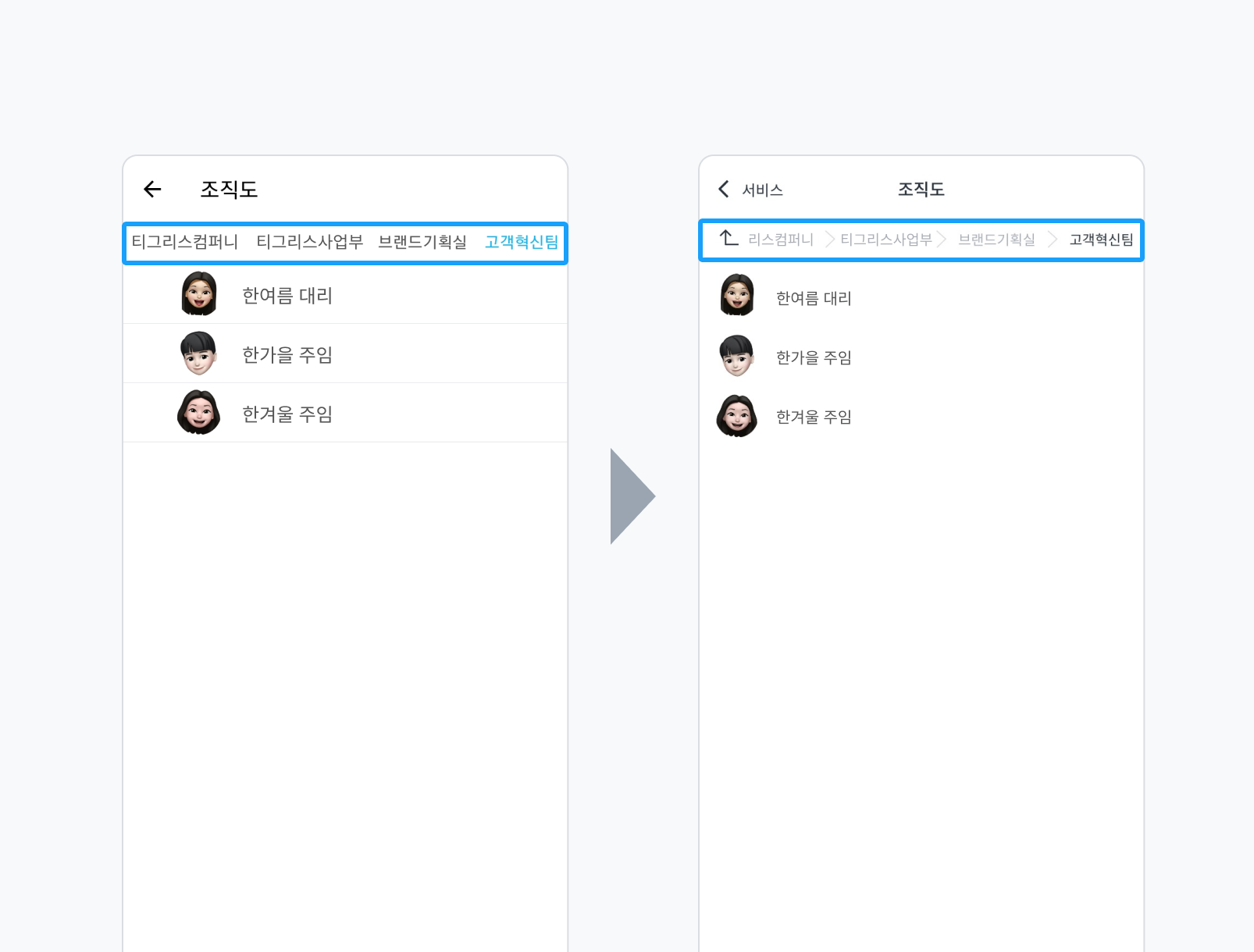 또, 조직도의 상단 경로도 수정되었습니다. 조직도의 메인으로 이동할 수 있는 버튼을 추가했고, 상단 경로 디자인을 개선했습니다. 각각의 조직을 터치하면 해당 조직 화면으로 이동하니, 상위 조직과 하위 조직을 편리하게 확인해 보세요.