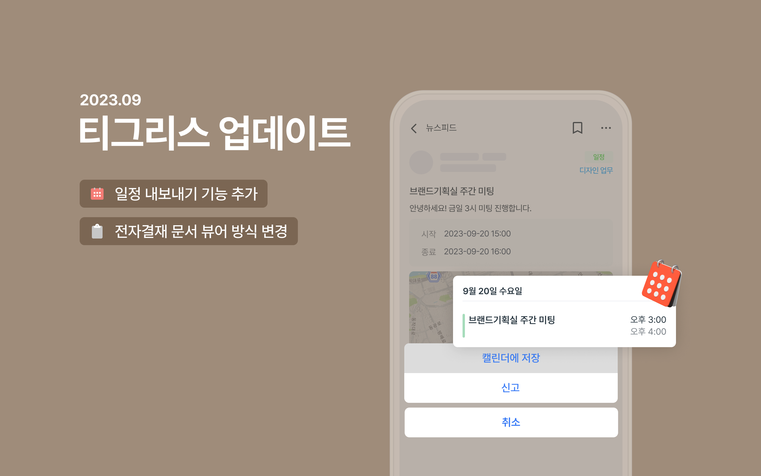 티그리스에 등록된 일정을 모바일 기기 캘린더에서도 관리하고 싶다는 사용자분들의 피드백을 반영해 일정 게시물을 모바일 기기 캘린더로 내보내는 기능을 새롭게 추가했습니다. 이제 티그리스에서 원하는 일정을 모바일 기기 캘린더로 저장해 관리하실 수 있습니다.