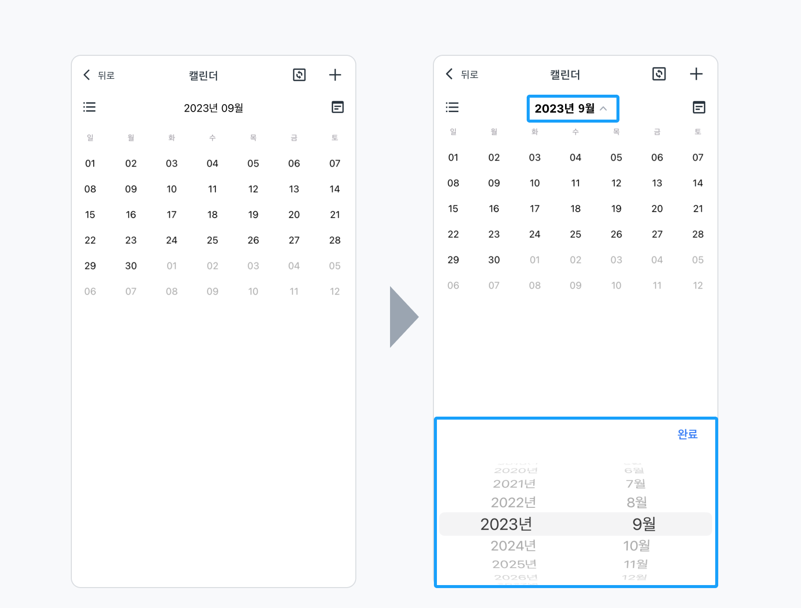 캘린더에서 원하는 날짜를 쉽게 찾을 수 있도록 캘린더의 연월 표시 부분을 터치하면 연(年)과 월(月)을 선택하는 박스가 나오도록 수정했습니다.