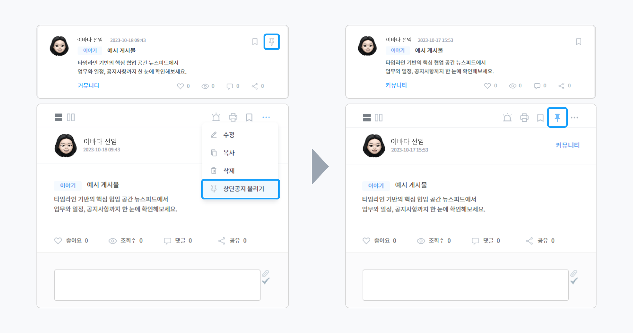 '상단공지 올리기' 아이콘 위치가 게시글 상세보기 화면 오른쪽 상단으로 통합되었습니다. 기존 뉴스피드 게시글 미리보기 오른쪽 상단 아이콘과 게시글 상세보기 화면 오른쪽 상단 [ … ](더보기)메뉴 내 [상단공지 올리기] 버튼은 삭제되었습니다.
