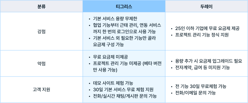 지금까지 올인원 업무 도구 티그리스와 두레이의 주요 기능과 특징을 소개했는데요. 두 서비스의 차이점, 잘 확인하셨나요?