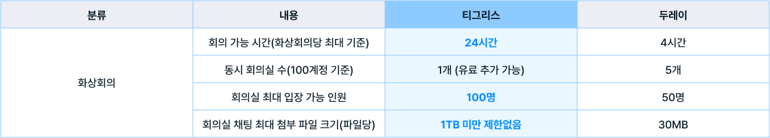 비대면 환경에서 유용한 화상회의 기능도 확인해 보세요. 티그리스는 동시 회의실(채널) 수를 원하는 만큼 사용할 수 있습니다. 화상회의를 자주 사용하는 기업이라면, 인원이 적더라도 여러 채널을 사용하는 것이 좋겠죠?