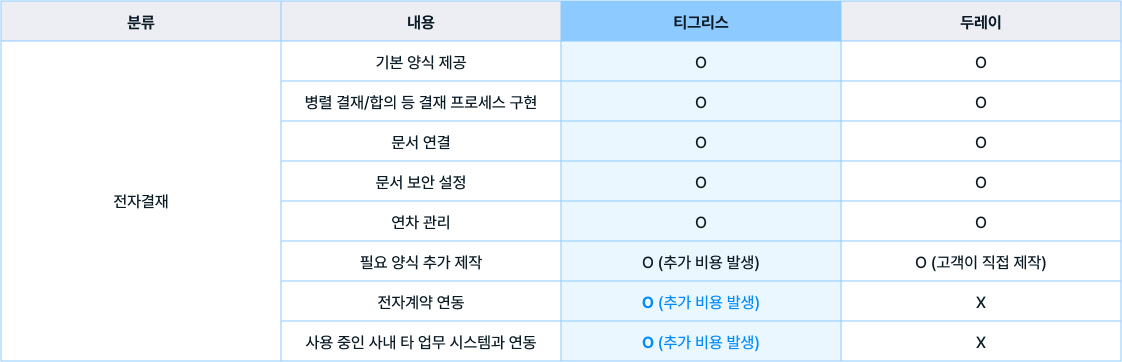 티그리스는 두레이에서 제공하지 않는 전자계약, 사내 타 업무 시스템과의 연동을 지원합니다. 사내에서 결재 처리가 많고 결재가 중요하다면 전자결재 세부 기능까지 꼼꼼하게 확인해 보세요!