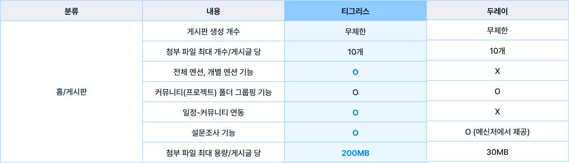 올인원 협업툴 티그리스와 두레이는 모두 업무에 필요한 기능을 다양하게 제공하고 있는데요. 아래 표로 더 자세히 알아볼까요?