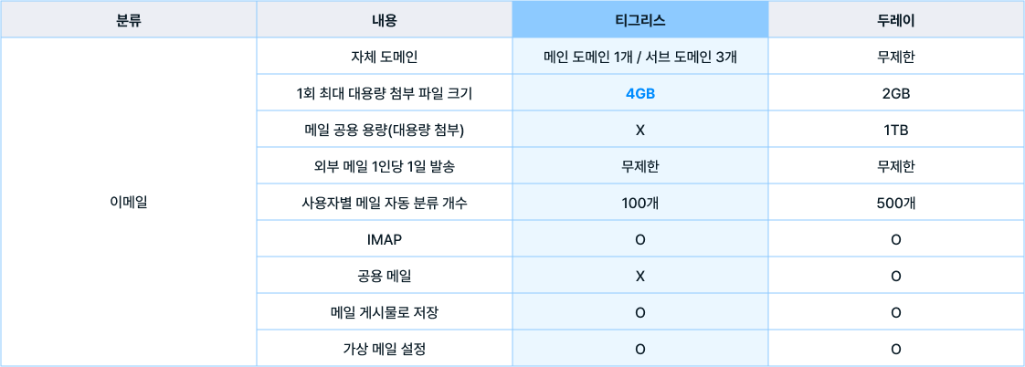 이메일의 경우 두레이는 무제한 도메인을 제공하며, 공용 메일 설정이 가능합니다. 많은 도메인과 공용 메일이 필요한 경우 두레이 메일이 유리합니다. 대용량 첨부 파일은 두레이가 2GB, 티그리스가 4GB로 티그리스의 제공 용량이 더 많습니다.