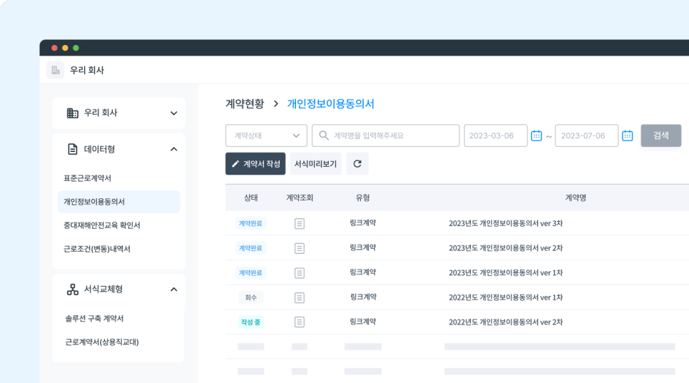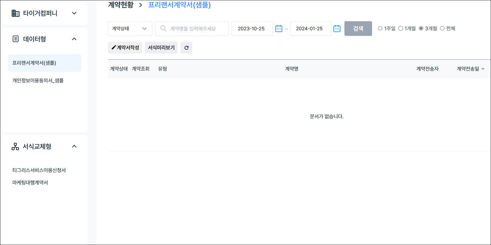 전자계약서비스를 클릭하면 데이터형과