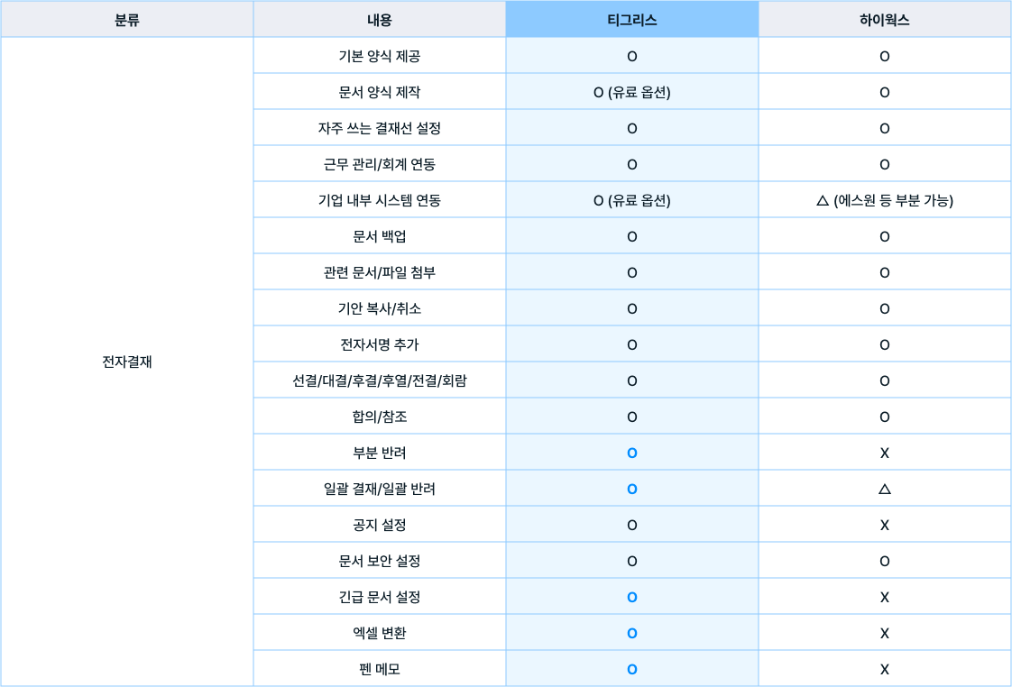 티그리스와 하이웍스 모두 결재 프로세스에 따른 기능을 구현했습니다. 티그리스는 결재 과정을 더 상세하게 구현했으며, 기안자와 결재자의 편의를 고려했습니다.