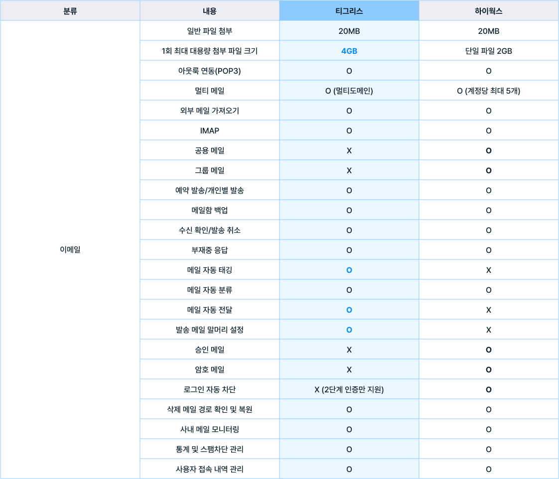 하이웍스의 경우 현재 티그리스에서 제공하지 않는 공용 메일과 그룹 메일, 승인 메일, 암호 메일 등이 잘 구현되어 있습니다. 티그리스는 하이웍스에 없는 메일 자동 태깅, 메일 자동 전달, 말머리 설정 등의 기능을 제공하고, 대용량 파일 첨부 시 제공 용량이 더 큽니다.