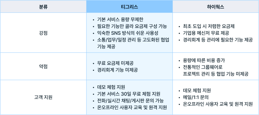 최초 도입 시 하이웍스의 비용 부담이 적을 수 있으나, 장기 사용 시에는 사용량이 늘어도 요금 변동이 없는 티그리스가 더 합리적일 수 있습니다.