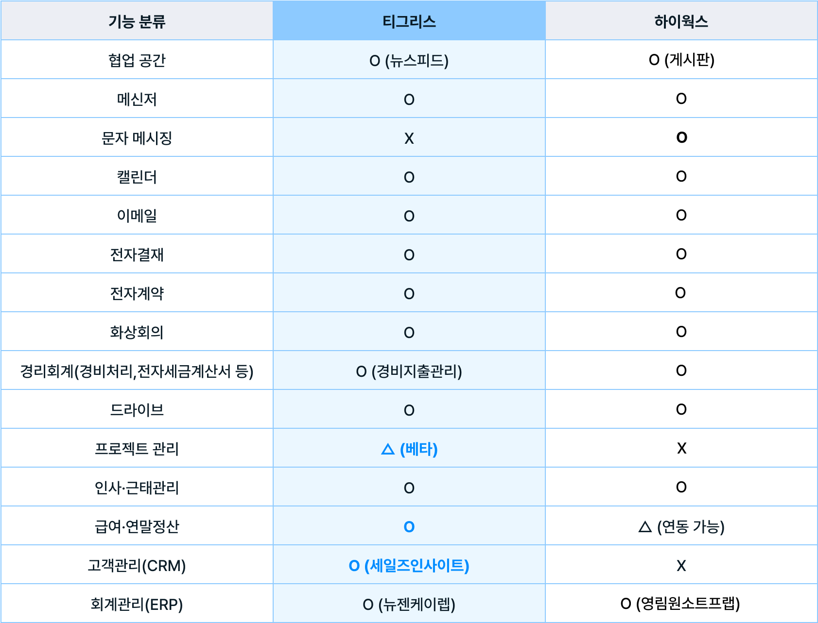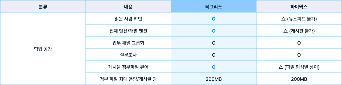 티그리스의 경우 뉴스피드와 커뮤니티를 제공하고 있고, 하이웍스는 오피스 내 뉴스피드와 게시판을 제공합니다.