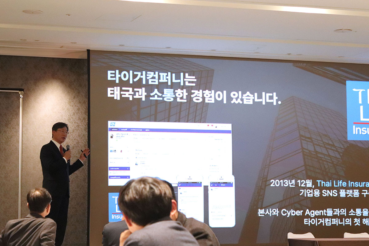 김범진 대표는 "태국과 교류하는 자리에서 타이거컴퍼니의 서비스를 소개할 수 있어 기쁘다. 타이거컴퍼니는 지난 2013년에 이미 태국과 소통한 경험이 있다. 태국생명보험(Thai Life Insurance Public)에 기업용 SNS 플랫폼 구축 사업을 성공적으로 수행했고, 이 프로젝트가 타이거컴퍼니 글로벌 진출의 첫걸음이 되었다"고 태국과의 인연을 밝히며 발표를 시작했다.