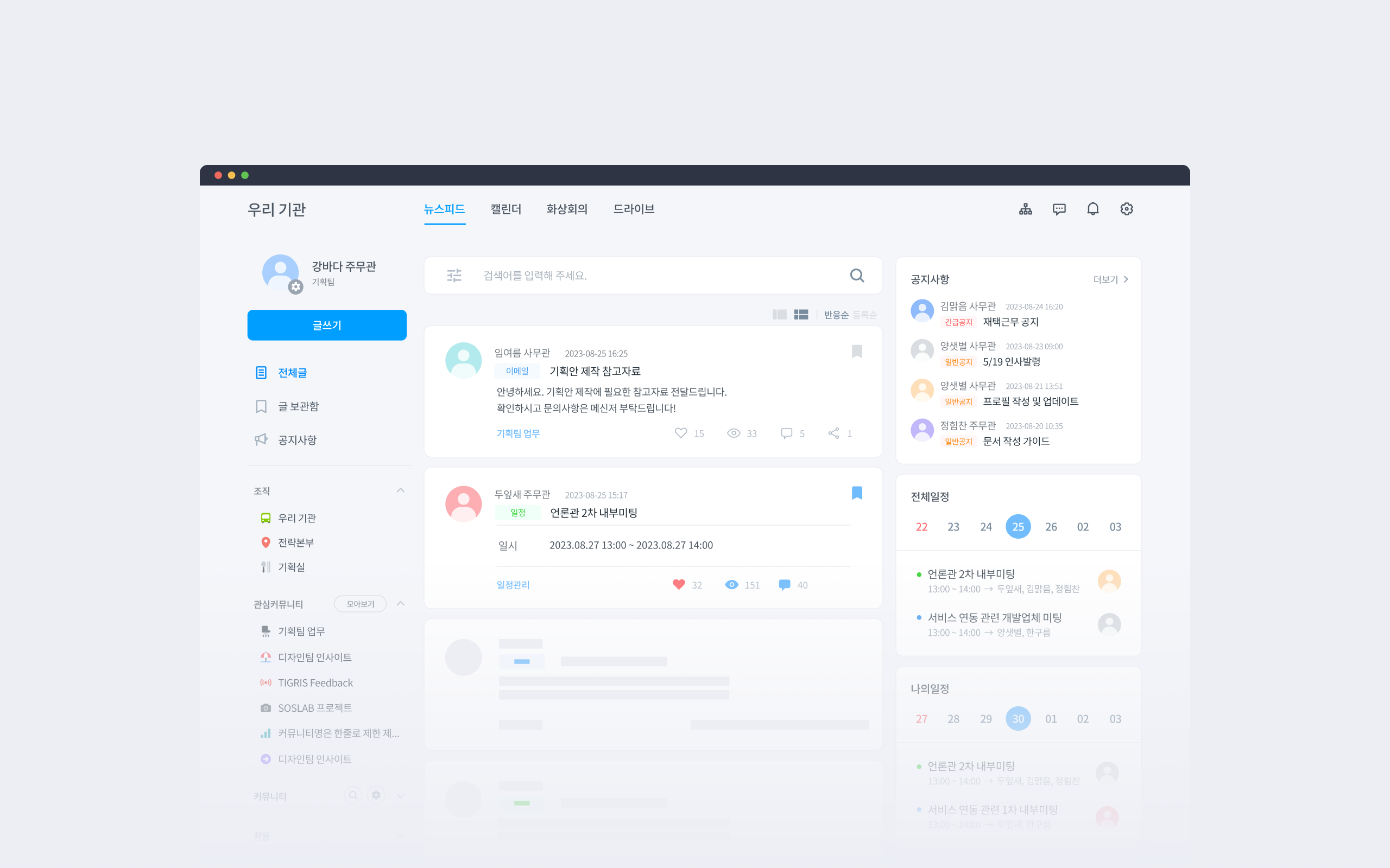C기관 역시 보안상의 이유로 온프레미스 방식으로 솔루션을 구축해 사용하고 있습니다. 물리적 망분리가 되어 있어 내부에서만 업무 시스템을 사용할 수 있습니다. C기관의 경우 포털 뉴스형으로 구축되었고, 기관 맞춤형 전자결재 연동 등 추가 기능이 다수 적용되었습니다. 구축 이후 3번의 고도화 작업이 진행되었으며, 지속적인 유지보수가 진행되고 있습니다.