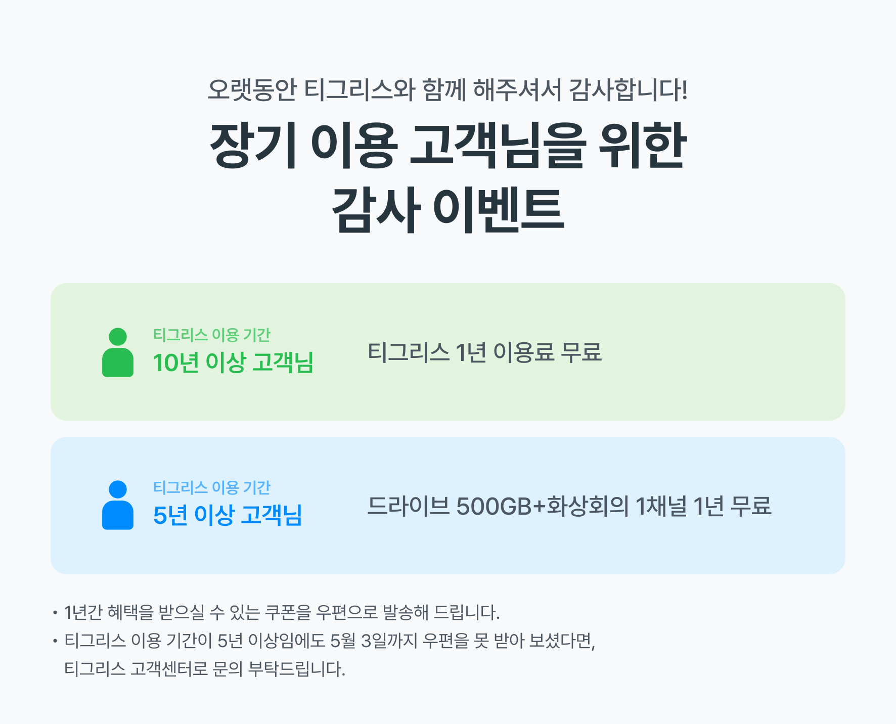 티그리스를 5년 이상 사용한 고객에게는 1년 동안 드라이브 500GB와 화상회의 1채널을 무료로 제공합니다.
