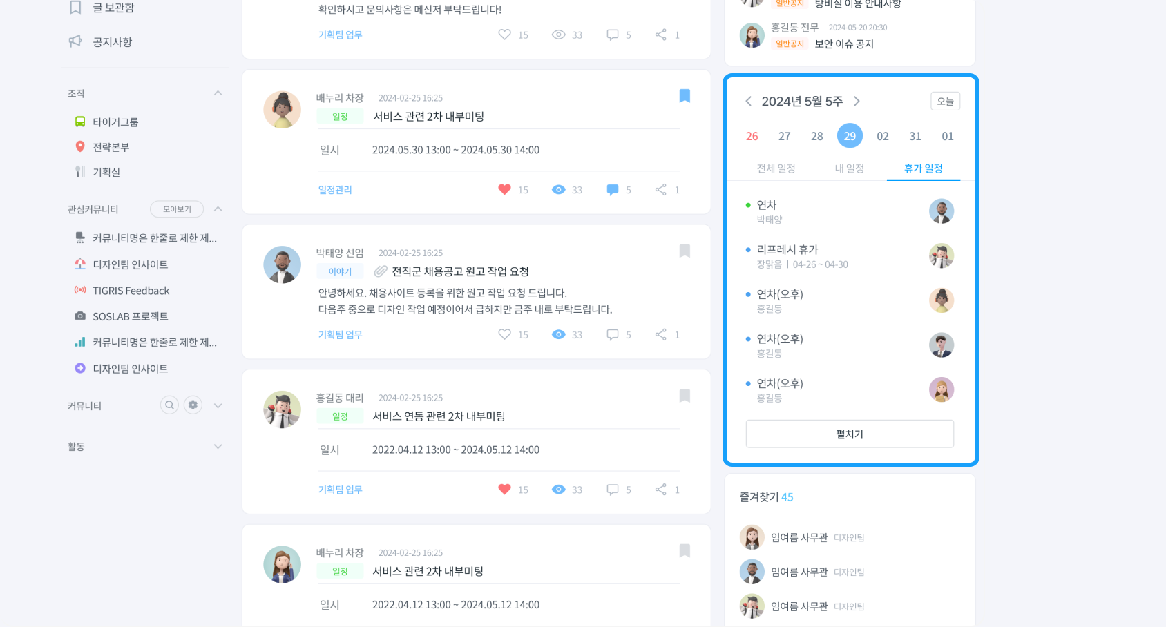 HRM 상의 휴가 일정 정보를 티그리 스 화면 오른쪽의 일정 영역에서도 확인하실 수 있도록 업데이트를 진행했습니다.