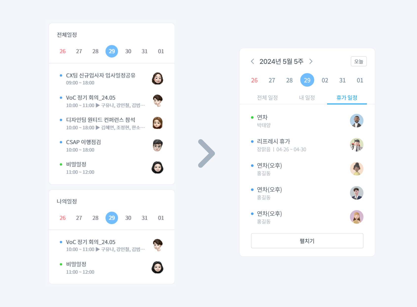 사진과 같이 기존에 전체 일정과 나의 일정으로 분리되어 있던 영역을 하나의 일정 영역으로 통합하고,