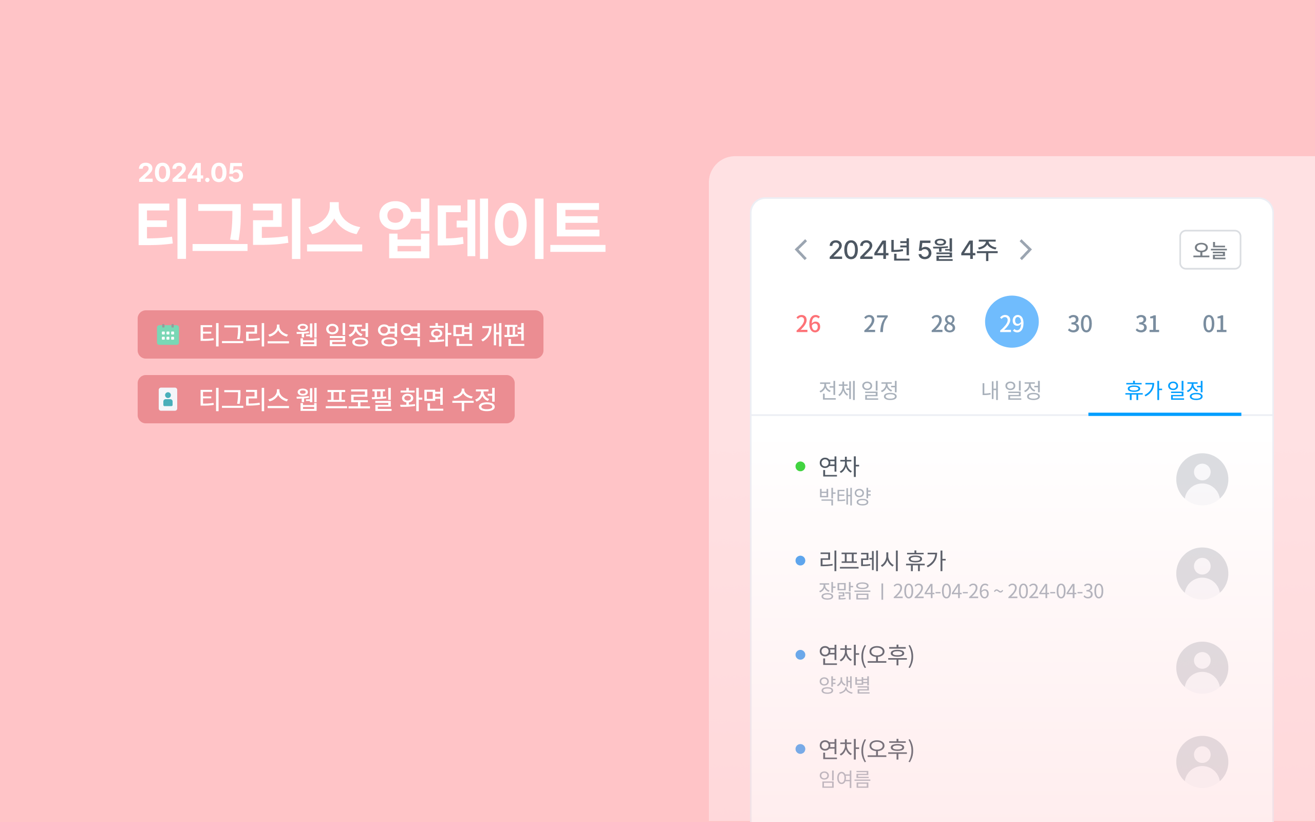 HRM 상의 휴가 일정 정보를 티그리 스 화면 오른쪽의 일정 영역에서도 확인하실 수 있도록 업데이트를 진행했습니다.