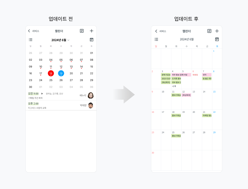 이번 업데이트를 통해 월간 일정을 한눈에 볼 수 있도록 캘린더 월간 보기 방식을 변경했습니다.