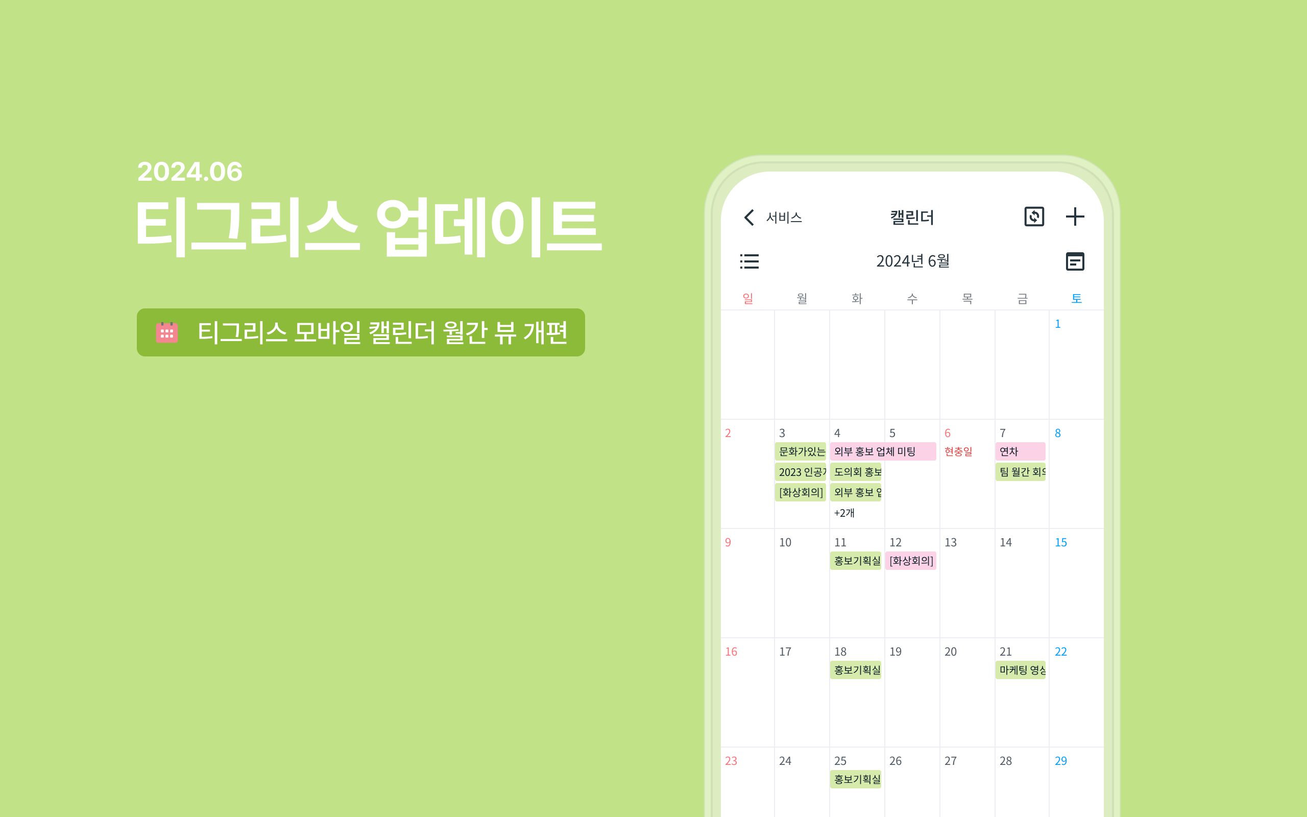 6월 19일 티그리스 모바일 업데이트가 진행되었습니다. 이번 업데이트에서는 캘린더 월간 뷰 화면을 개선했는데요. 이제 모바일 캘린더에서 월간 일정을 한눈에 확인할 수 있습니다.