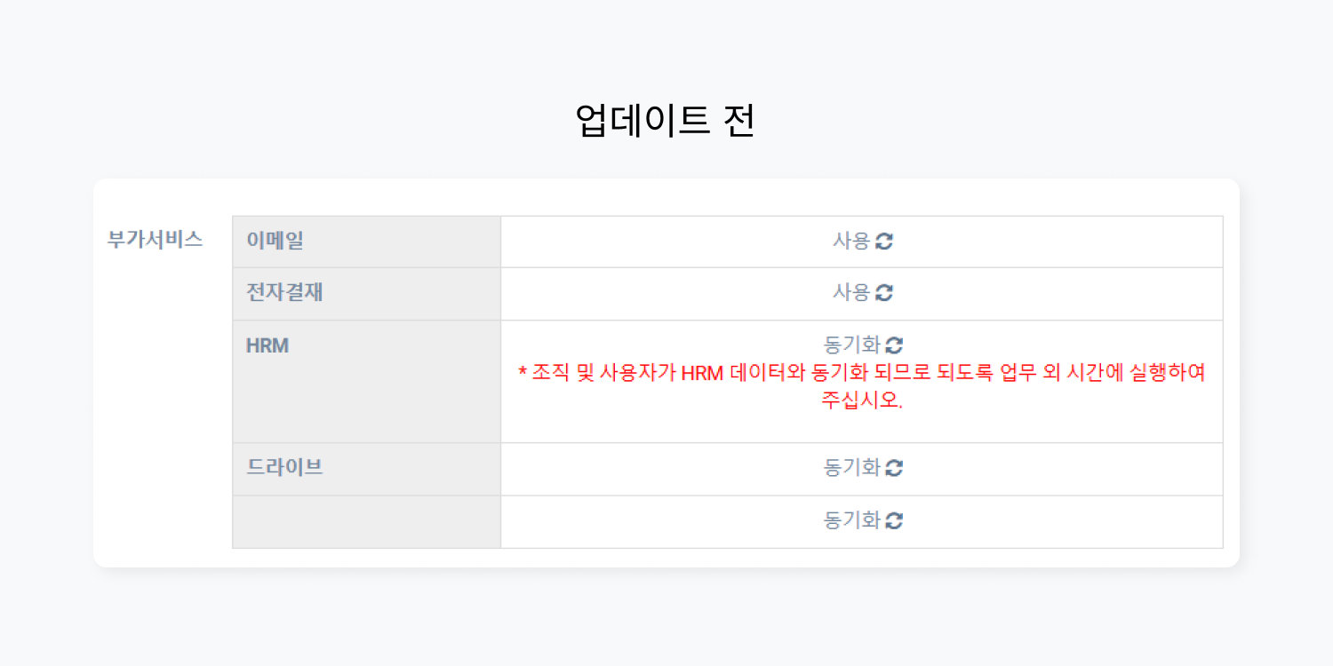 기존에는 이메일, 전자결재, 드라이브, HRM 동기화가 분리되어 있었습니다. 동기화 진행 시 각 기능 옆 동기화 아이콘을 각각 클릭해야 했는데요.