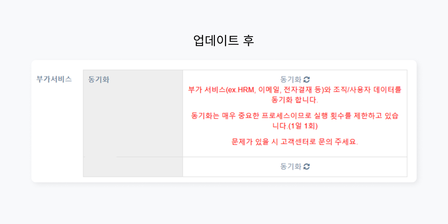 또한, 안정적인 서비스 이용과 동기화 진행을 위해 부가서비스 동기화가 일 1회로 제한됩니다. 동기화 진행 전 변경사항을 충분히 확인하신 후 동기화를 진행해 주세요.