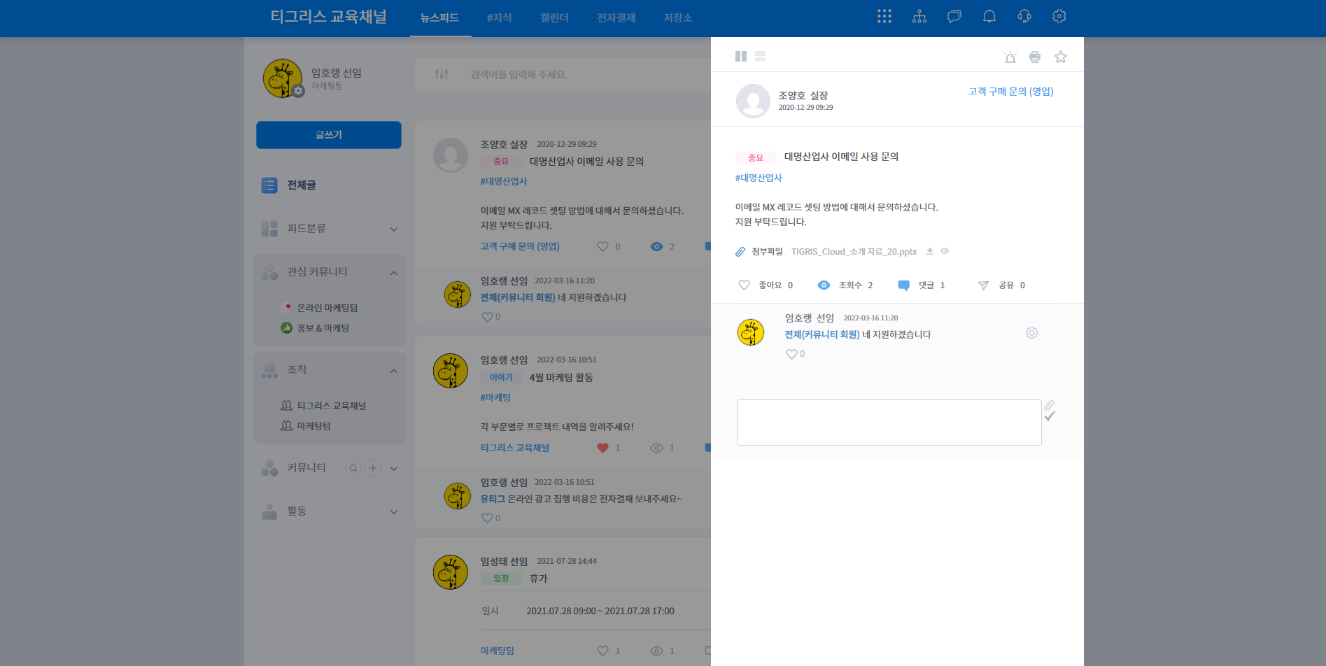 모두 함께 달성한 결과는 @전체 멘션으로 모두에게 공유해주세요. 함께 고생한 팀원들에게 좋아요 버튼과 수고했다는 한마디도 남겨주면 더욱 좋겠죠! 남겨진 자료는 무제한 용량으로 제공되는 저장소에서 언제든 필요할 때 확인할 수 있습니다.