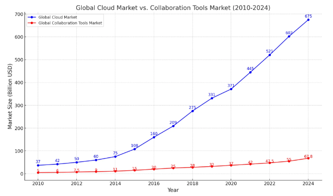 첨부한 자료를 바탕으로 차트를 만들어 줘. 2010년부터 2024년까지의 글로벌 클라우드 시장과 협업툴 시장의 규모를 하나의 차트로 생성해 줘. 글로벌 클라우드 시장 규모를 파란색으로 표현하고, 글로벌 협업툴 시장 규모를 빨간색으로 표현해 줘. x축은 시간, y축은 클라우드 시장과 협업툴 시장의 규모야.