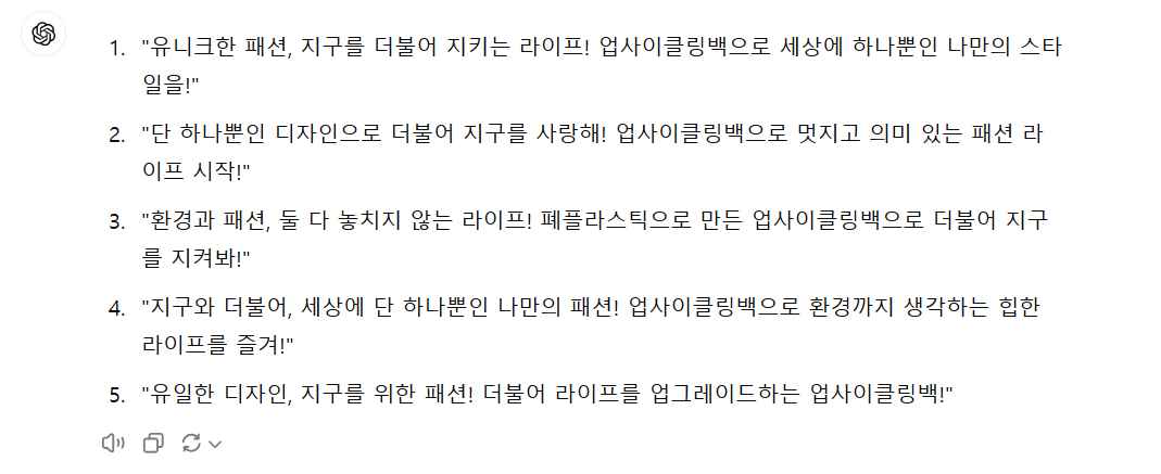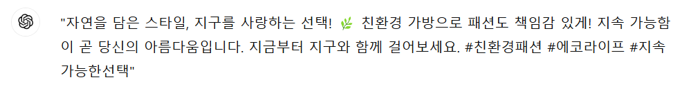 새롭게 출시되는 친환경 업사이클링백에 관한 광고 카피를 만든다고 가정해 보겠습니다. 일반적으로 프롬프트를 작성할 때 자주 하는 실수는, 다음 프롬프트처럼 단순한 지시를 내리는 것입니다.
