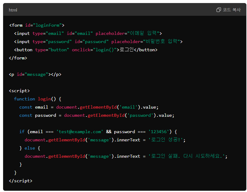이 프롬프트는 사용하는 언어(JavaScript와 HTML)를 명시하고, 구체적인 기능(로그인 실패 시 에러 메시지, 성공 시 성공 메시지)을 요청함으로써 AI가 정확한 코드를 작성할 수 있도록 합니다.