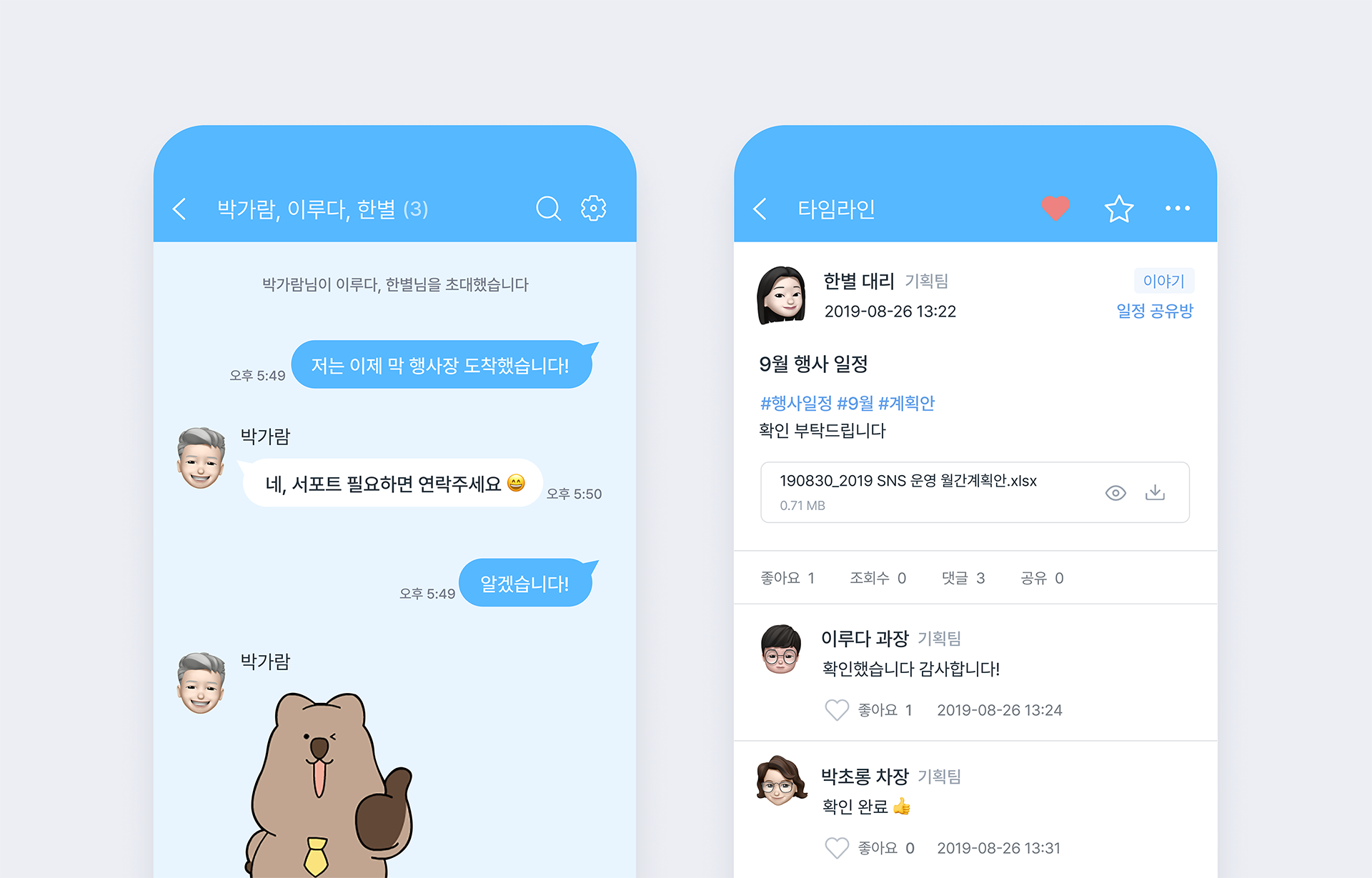 공지를 올리거나 새로운 양식을 공유하는 것도 간편해요. 조직도 기반으로 부서별로 피드에서 일하고 파일을 공유할 수 있다는 것도 상당한 장점입니다. 또, 커뮤니티를 개설하면 프로젝트별로 업무를 진행하고, 자료를 저장할 수 있는데요. 1년 동안 저장된 데이터를 다시 보고 추후에 활용할 수 있어 효율성이 뛰어납니다.