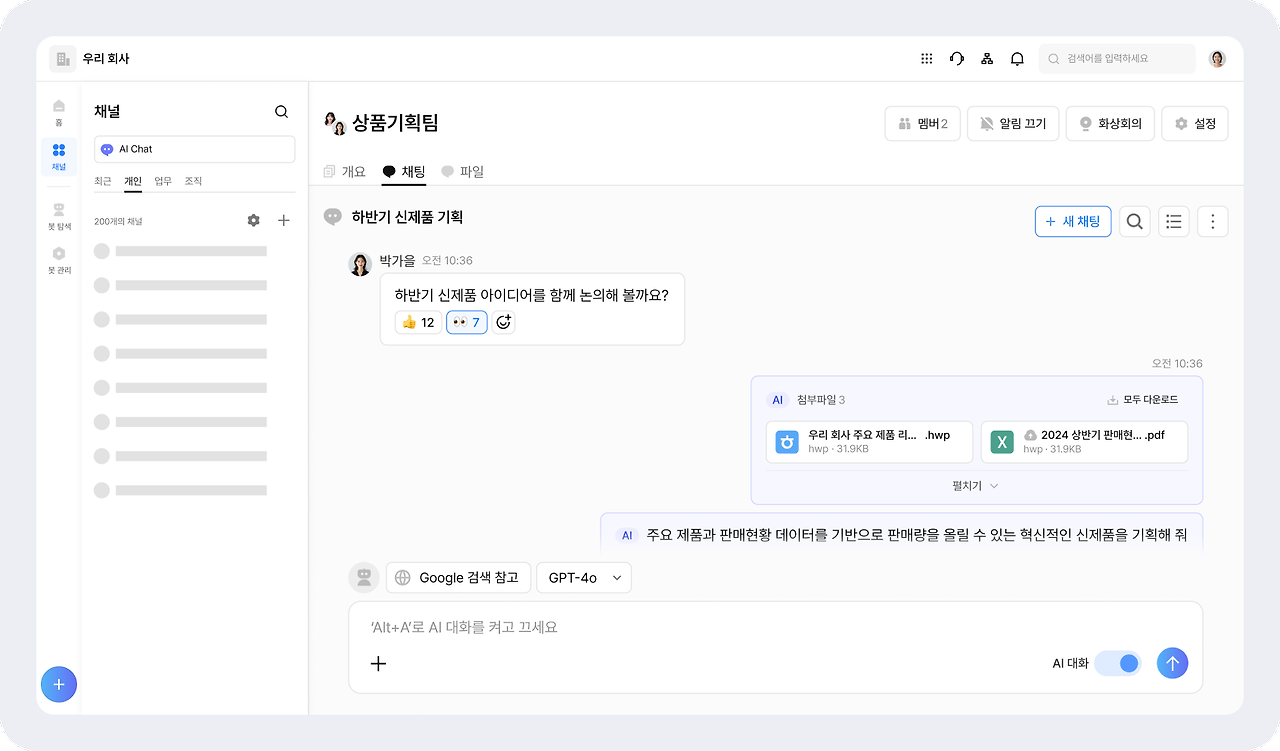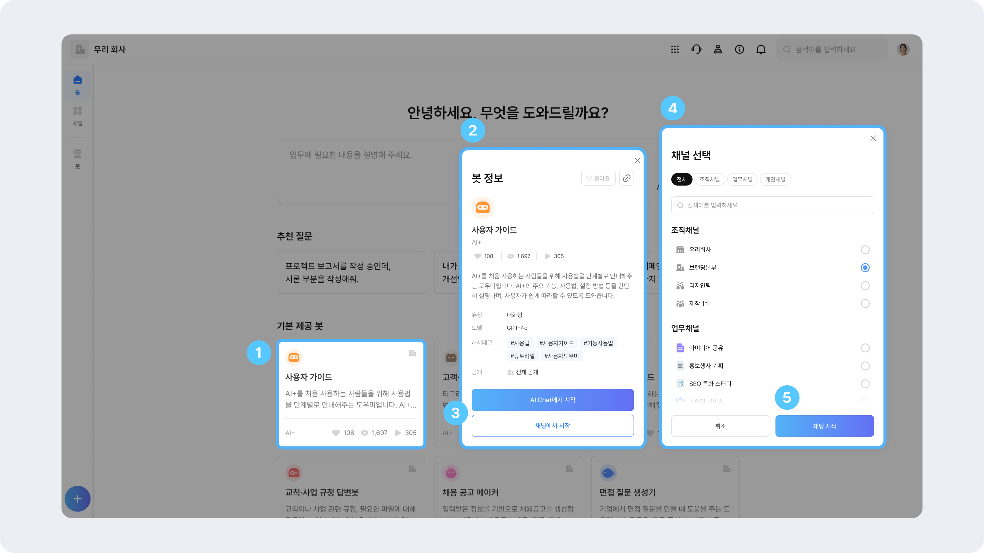 AI Chat은 물론이고, 다양한 업무 채널에서 동일한 방식으로 AI 봇을 사용할 수 있습니다.