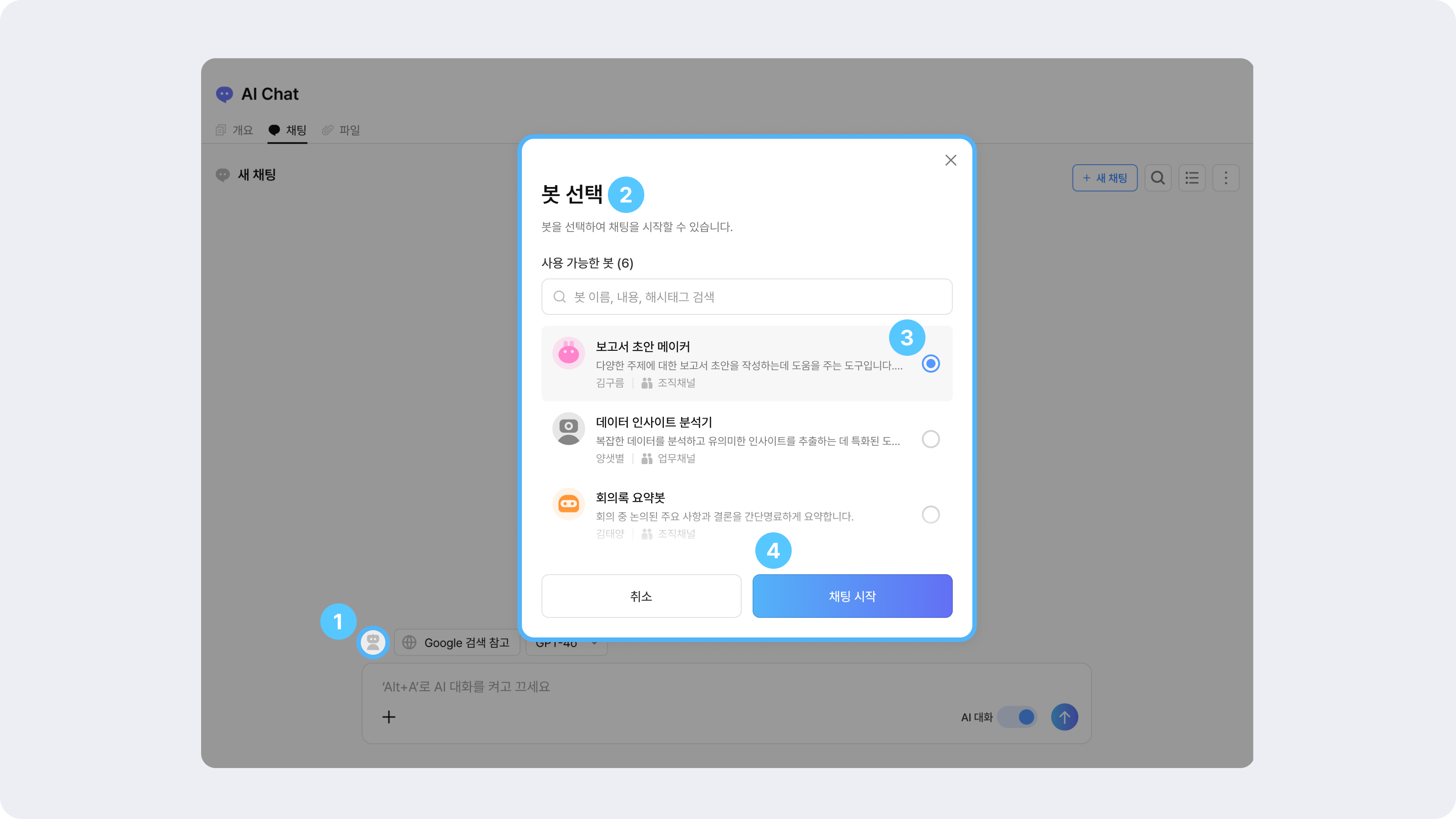 메시지 입력창 위 AI 봇 아이콘을 클릭한 후, 사용할 봇을 찾아 선택하고 [채팅 시작] 버튼을 클릭하면 끝입니다.