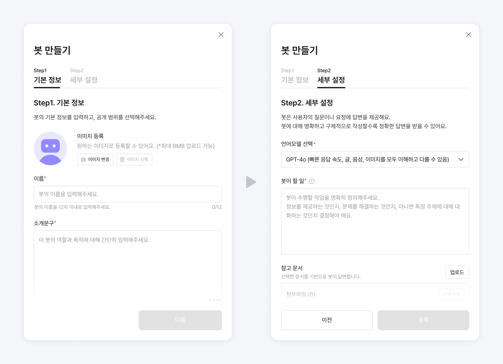 봇이 할 일을 상세히 작성하고, 참고 문서를 첨부하면 더 좋은 결과를 도출할 수 있습니다.