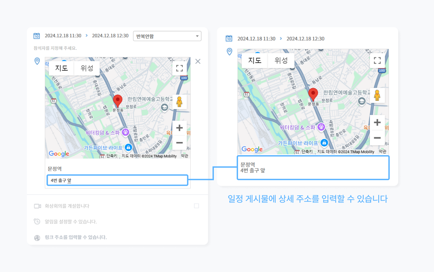 상세 주소란을 활용해 회의실 이름이나 집결지 등 장소에 대한 정보를 더 자세하게 안내할 수 있습니다.