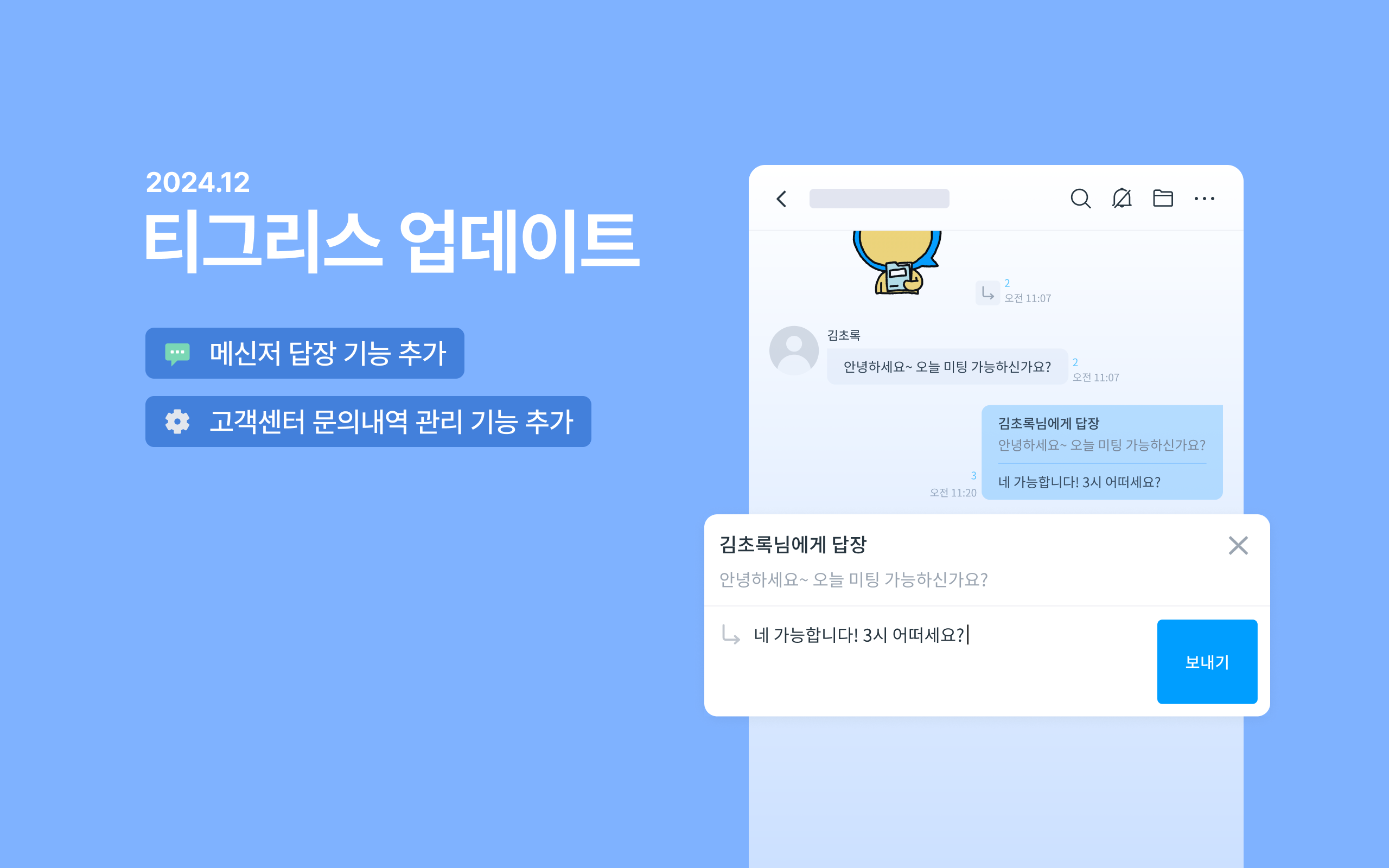 이번 업데이트에서는 메신저 답장, 우리 회사 문의 내역 조회 등 편리한 기능이 추가되었는데요. 아래에서 어떤 점이 달라졌는지 알아본 후, 티그리스에서 직접 사용해 보세요!