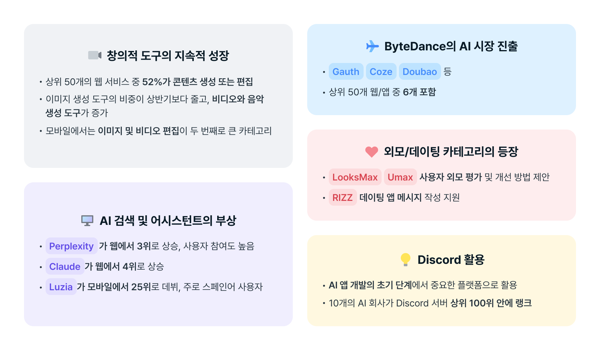 웹과 앱 모두에서 좋은 성적을 내고 있는 4개의 서비스는 ChatGPT, character.ai, Doubao, perplexity입니다.