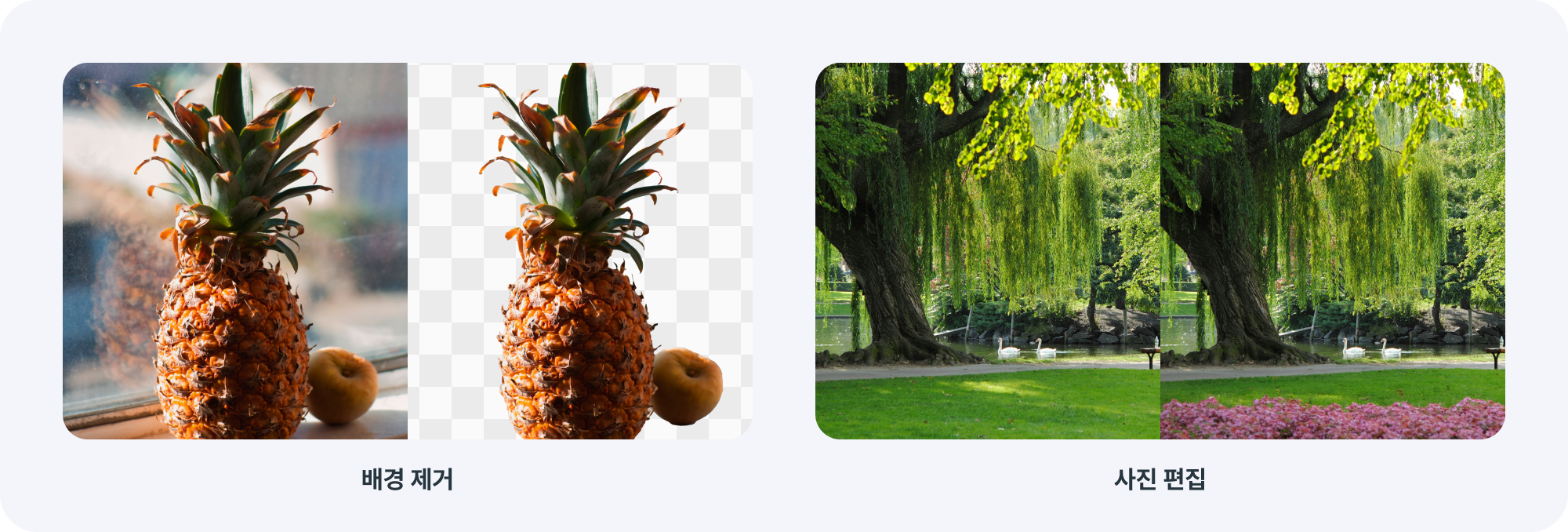 또한, 번거로운 작업을 자동화시켜줍니다. 크리에이티브 작업 분야에서 두드러지게 많이 사용하는 기능/서비스는 배경 제거, 사진 편집 기능과 같이 손이 많이 가는 작업입니다. 번거로운 작업을 자동화해 사용자가 핵심 작업에 집중하도록 도와주는데요. 디자인 툴을 전문적으로 만지지 못하는 일반 사용자들도 쉽게 해당 작업을 할 수 있게 되어 크리에이티브 작업 분야의 규모가 커지는 선순환이 되었습니다.