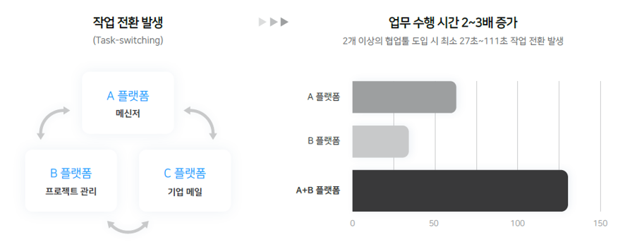 하나의 업무나 활동에 완전히 집중하기 위해 약 15분의 시간이 소요된다고 합니다. 그렇게 업무에 집중하는 과정에서 다른 도구로 넘어가게 되면 집중력이 중단되는데 이를 '작업 전환(Task-switching)'이라고 합니다. 작업 전환이 발생하면 업무의 생산성과 효율이 떨어지므로, 여러 가지 업무를 하나의 플랫폼에서 모두 처리할 수 있는지 확인하는 게 좋습니다.