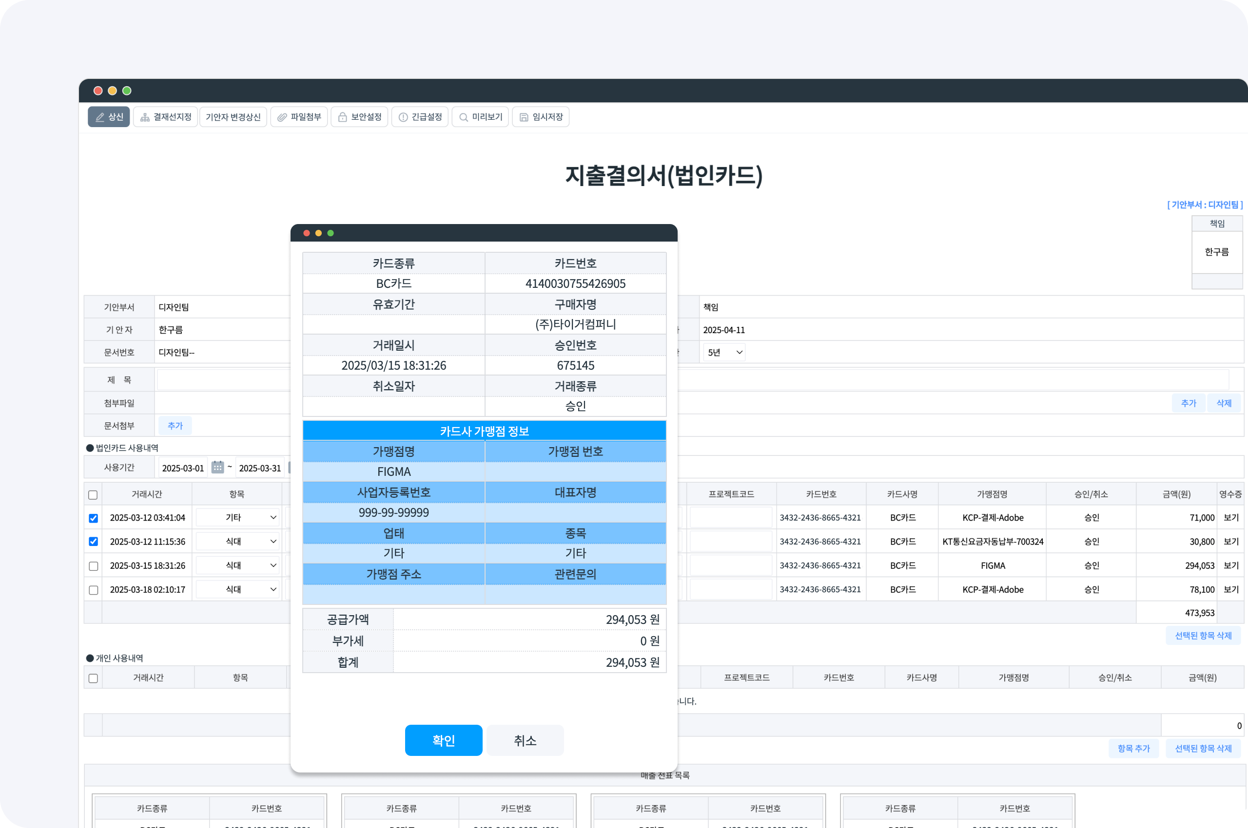 다음과 같이 전자결재 > 지출결의서 양식 선택 후 법인카드 내역창에서 지출결의할 카드와 사용내역을 선택할 수 있습니다.또한 카드 매출전표 확인 기능도 지원되어 결재시 카드 매출전표 출력이 필요한 경우에도 유용하게 사용할 수 있습니다.