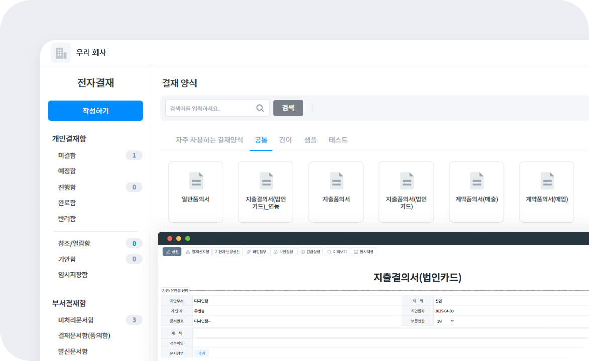 티그리스의 법인카드 연동 서비스는 티그리스의 전자결재 이용시 추가옵션으로 이용 가능한 서비스로, 전자결재 양식 중 지출결의서 작성시 이용 가능합니다. 그럼 티그리스 법인카드 연동 서비스의 구체적인 기능에 대해 알아볼까요?