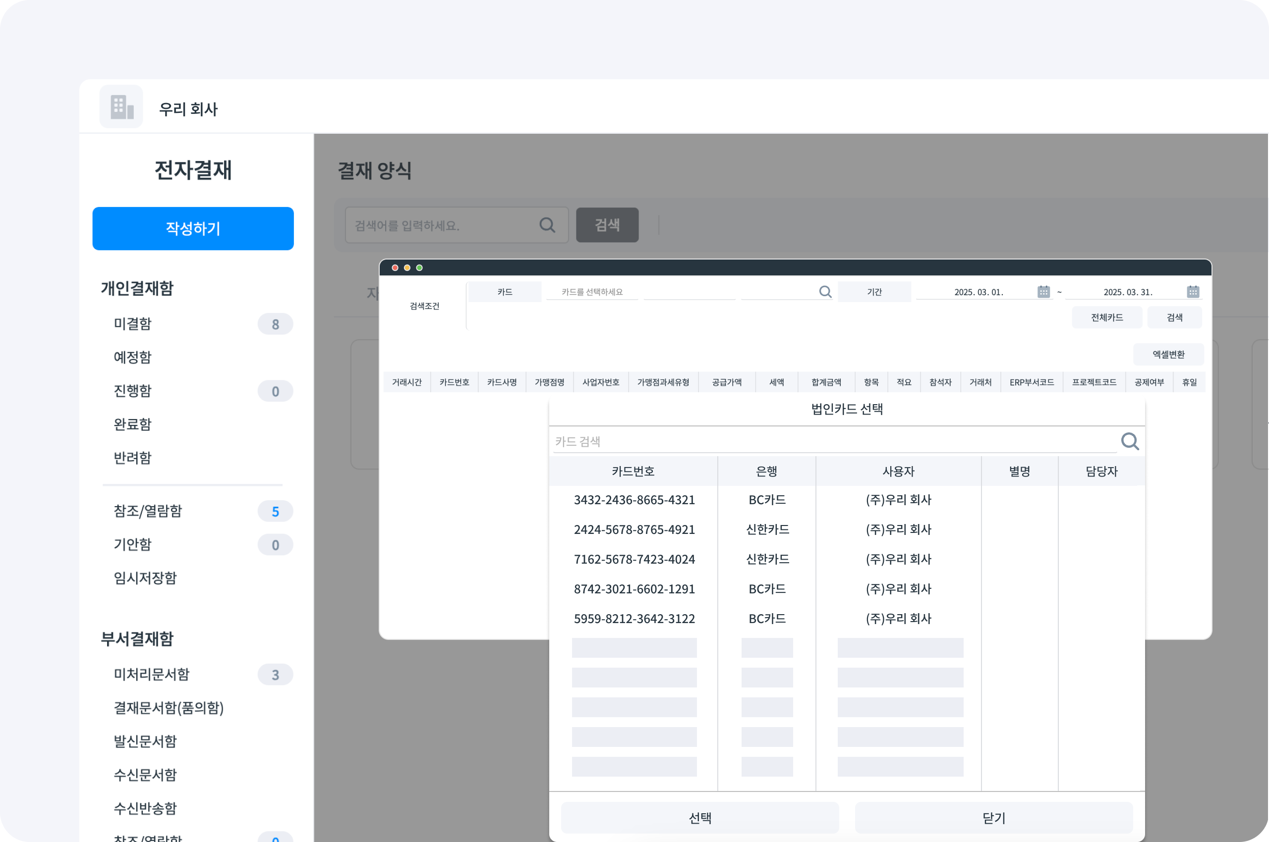 식대, 교통비, 출장비 등 지출결의서 항목에 대한 관리도 가능합니다. 법인카드의 별명 및 담당자를 설정할 수 있어 보다 체계적인 법인카드 관리가 가능합니다. 또한 관리자는 카드별 전체 법인카드의 사용 내역을 확인하고 엑셀로 다운로드 할 수 있습니다.