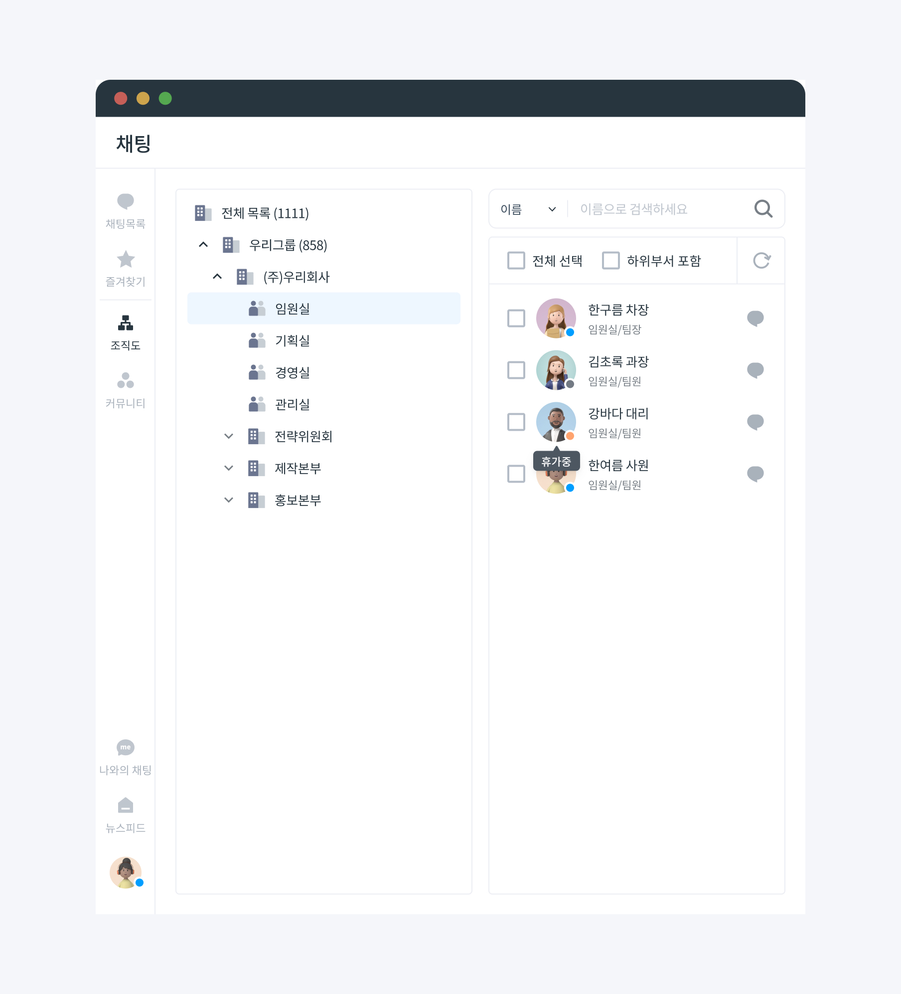 티그리스 조직도에서 조직 구성원들의 접속 상태(온라인, 자리비움, 출장중, 회의중 휴가중)를 확인할 수 있는데요.